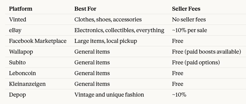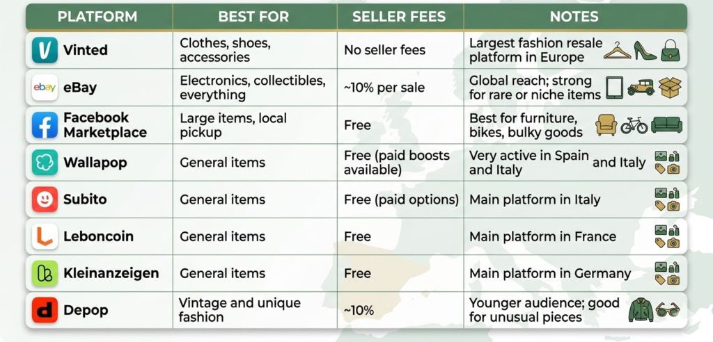 Comparison table of the best resale platforms in Europe, including Vinted, eBay, Facebook Marketplace, Wallapop, and others, with their fees, categories, and key benefits.