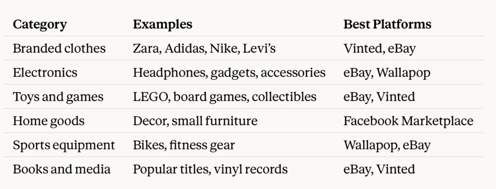 Table showing categories of resale products in Europe, including branded clothes, electronics, toys, home goods, sports equipment, and books, with examples like Zara, Nike, LEGO, and recommended platforms such as Vinted, eBay, Wallapop, and Facebook Marketplace.