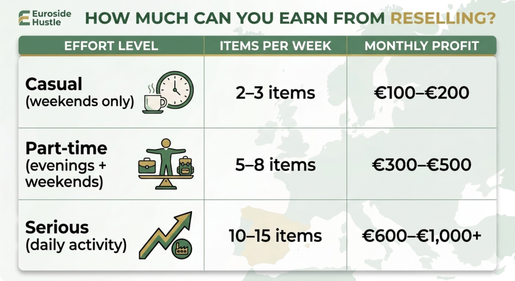 Table showing resale income potential based on effort level, from casual weekend selling to full daily activity, with estimated monthly profits in euros.